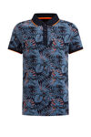Normal geschnittenes Poloshirt aus Baumwolle mit tropischem Muster, Knöpfen am Ausschnitt und seitlichen Schlitzen am Saum. Das Shirt hat einen kontrastierenden Polokragen und kurze Ärmel.