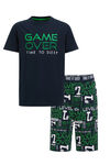 Normal geschnittener Schlafanzug aus Baumwoll-Mix mit Muster, Aufdruck und Streifenbesatz. Ausgestattet mit rundem Ausschnitt, kurzen Ärmeln und schmalem Bein.