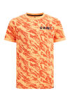 Normal geschnittenes T-Shirt aus Baumwolle mit Muster und aufgedrucktem Schriftzug auf der Brust. Das Shirt hat einen runden Ausschnitt und kurze Ärmel.