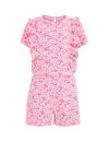 Ein trendiger Jumpsuit aus einer Baumwollmischung mit einem auffälligen Muster. Das Modell hat einen Rundhalsausschnitt, kurze Ärmel mit Rüschen und einen bequemen, elastischen Bund.