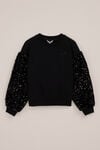 Weich und glänzend! Dieser Oversize-Pullover hat einen Rundhalsausschnitt und lange Ärmel mit Rippbündchen, wobei die Ärmel aus schwarzem Samt bestehen und komplett mit schwarzen Pailletten besetzt sind. Auf der Brust befindet sich eine kleine Stickerei mit einer Schleife, die für einen verspielten Touch sorgt.