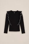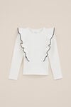 So kannst du die schönsten Outfits kreieren. Dieses T-Shirt aus weichem Rippstoff hat eine normale Passform, einen Rundhalsausschnitt und lange Ärmel. Die Rüschen auf der Vorder- und Rückseite verleihen ihm einen fröhlichen Touch, und die schwarzen Nähte entlang der Kanten sorgen für einen kleinen zusätzlichen Kontrast.
