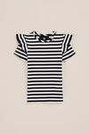 Charmantes T-Shirt aus weichem Baumwoll-Mix mit subtiler Rippstruktur und süßen Rüschen. Es hat einen komfortablen Rundausschnitt und luftige und kurze Ärmel.