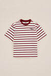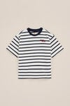 Gestreift mit einem Augenzwinkern. Dieses normal geschnittene T-Shirt mit kurze Ärmeln, Rundhalsausschnitt und dezentem gesticktem Text auf der Brust ist alles andere als langweilig. Sitzt gut, sieht toll aus und passt mühelos zu jedem Outfit; vom Schulhof bis zum Spielplatz.