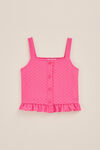 Ein Must-have für jedes Mädchen. Dieses schmal geschnittene Oberteil hat einen quadratischen Ausschnitt, dünne Schulterträger, Zierknöpfe, Rüschen am unteren Rand und eine dickere Struktur. Ob mit oder ohne die passende Hose, das Teil sieht gut aus und ist dank des Stretchanteils auch noch super bequem.