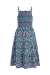 Ein normal geschnittenes Baumwollkleid mit einem gemusterten und gesmokten Oberteil. Das Modell hat verstellbare Spaghetti-Träger und einen Volant am unteren Saum.
