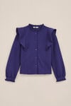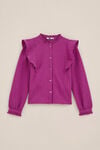 Modisch und bequem. Diese Strickjacke hat lange Ärmel, einen Rundhalsausschnitt und einen Rüschenbesatz an den Manschetten und am Kragen.