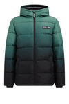Eine normal geschnittene Jacke aus recyceltem Polyester mit Batikmuster und zwei Seitentaschen mit Druckknopfverschluss. Das mit Fleece gefütterte Modell hat eine Kapuze mit Fleecefutter und einen Reißverschluss. Die Jacke hat eine Innentasche und ein Namensetikett.