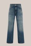 Lockere Passform, 5-Pocket, Reißverschluss und Knopfverschluss, weites Bein mit gedrehten Nähten an den Hosenbeinen, dunkle Jeans mit heller Waschung. Aus 100 % Baumwolle