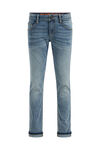 Blue Ridge 5-Pocket-Jeans aus elastischem Baumwoll-Denim mit Regular-Fit-Passform, normaler Bundhöhe, Reißverschluss mit Knopf und verstellbarem Gummizug am Bund. Das Hosenbein ist schmal zulaufend und auf der Innenseite mit einem dekorativen Streifen versehen.