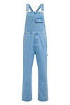 Blue Ridge Latzhose aus Baumwollmischung mit zwei Seitentaschen, zwei Brusttaschen und zwei Gesäßtaschen. Das Modell hat gerade Beine, einen Reißverschluss und einen Knopfverschluss.