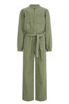 Normal geschnittener Jeans-Overall aus Baumwolle mit zwei Brusttaschen, Reißverschluss und Gürtel. Das Modell hat einen normalen Kragen, lange Ärmel und gerade Beine.
