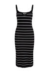 Normal geschnittenes Kleid aus feinem Strick mit Streifen- und Strukturmuster. Das Kleid hat einen V-Ausschnitt und schmale Träger mit Rippbündchen.