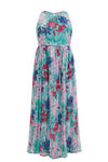 Normal geschnittenes Kleid aus fein gewebtem Material mit Muster, Gürtel und Pliseerock. Das Modell hat einen runden Ausschnitt mit Knopfverschluss und verdecktem Reißverschluss. Das Kleid reicht bis zum Knöchel.