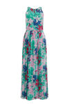 Normal geschnittenes Kleid aus fein gewebtem Material mit Muster, Gürtel und Pliseerock. Das Modell hat einen runden Ausschnitt mit Knopfverschluss und verdecktem Reißverschluss. Das Kleid reicht bis zum Knöchel.