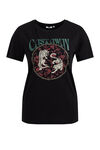 Normal geschnittenes T-Shirt aus Baumwoll-Mix mit dekorativem Aufdruck auf der Vorderseite. Das Shirt hat einen runden Ausschnitt und kurze Ärmel.