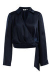 Normal geschnittene Bluse aus fein gewebtem Material in glänzender Satin-Optik mit Bändchenverschluss. Die Bluse hat einen V-Ausschnitt und lange Ärmel.