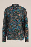 Eine Bluse in normaler Passform aus recyceltem Polyester mit einem Muster und verdecktem Knopfverschluss. Das Modell hat einen normalen Kragen und lange Ärmel.