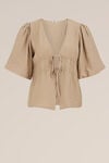 Auf die richtige Weise dramatisch. Diese Bluse hat eine normale Passform, einen offenen V-Ausschnitt und kurze Ballonärmel. Die Schleifen und Kordeln verleihen ihr eine verspielte Note. Luftig, feminin und perfekt für einen Auftritt mit Wirkung.