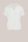 Bequem mit einem raffinierten Look. Diese Bluse hat eine normale Passform, einen Kragen mit V-Ausschnitt und Knopfverschluss, kurze Ärmel und einen weichen Stoff mit einem Allover-Muster aus abgesteppten Kreisen.