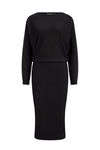 Ein normal geschnittenes Kleid aus einer Viskosemischung mit Rippenstruktur. Ausgestattet mit rundem Ausschnitt und langen Ärmeln. Das Kleid fällt über das Knie und ist ab der Taille enger geschnitten.
