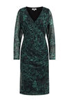 Figurbetontes Mesh-Kleid mit durchgehendem Blumenmuster, Unterrock und seitlicher Raffung. Das Kleid hat einen V-Ausschnitt und lange Ärmel.
