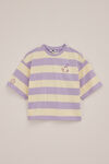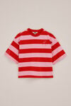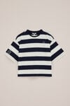 Verspielt und lässig mit süßen Details. Dieses gestreifte T-Shirt für Mädchen hat eine übergroße Passform, einen Rundhalsausschnitt und kurze Ärmel. Es ist mit breiten Querstreifen und einem kleinen Herz mit Pfeil-Stickerei auf der Brust bestickt.