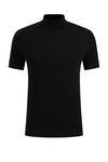 Normal geschnittener Feinstrickpullover aus Baumwoll-Mix mit Stehkragen und kurzen Ärmeln.