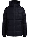 Wattierter Parka aus Polyester mit Reißverschluss, zwei Eingrifftaschen mit Druckknopf und einer schrägen Brusttasche. Ausgestattet mit Kapuze, einer Innentasche und langen Ärmeln mit Rippbündchen.