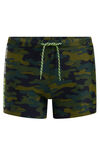 Normal geschnittene Badehose mit Camouflage-Muster, seitlichem Aufdruck, gefütterter Front und elastischem Bund mit Tunnelzug.