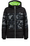 Normal geschnittene wattierte Jacke aus wasserabweisendem Material mit Muster und Streifenbesatz am Ärmel. Die Jacke ist mit einer Kapuze, einem Reißverschluss mit Kinnschutz, zwei Eingrifftaschen mit Druckknopf und einem weichen Fleecefutter ausgestattet.