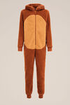 Normal geschnittener Anzug aus Teddyfleece mit langen Ärmeln, Kapuze mit Applikationen, Reißverschluss, zwei Eingrifftaschen, und langem Hosenbein.