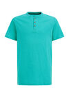 Normal geschnittenes T-Shirt aus Baumwolle mit melierter Optik und Knopfverschluss. Ausgestattet mit rundem Ausschnitt und kurzen Ärmeln.