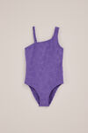 Bereit für den Schwimmunterricht? Dieser Badeanzug hat eine violette Blumenstruktur. Mit einem breiten Schulterriemen, einem verstellbaren Spaghettiträger und einer schrägen Linie auf der Vorderseite.