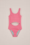 Auf die Plätze, fertig, los! Dieser strukturierte Badeanzug hat dünne Träger, einen Rundhalsausschnitt und einen verspielten Ausschnitt in der Mitte. Weich, dehnbar und bereit für den Sprung ins Unbekannte.