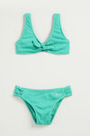 Gesmokter Bikini aus Polyamid-Mix. Das Oberteil hat vorne ein dekoratives Knoten-Detail und einen Kunststoffverschluss am Rücken.