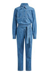 Normal geschnittener Jumpsuit aus Baumwoll-Denim mit Druckknöpfen, Brusttaschen, Gummizug in der Taille und abnehmbarem Bindegürtel. Der Anzug hat einen Hemdkragen und lange Ärmel.