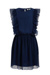 Normal geschnittenes Kleid aus fein gewebtem Material mit plissiertem Rockteil und Rüschen. Ausgestattet mit rundem Ausschnitt mit Knopf und Gummizug in der Taille.