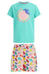 Zweiteiliger Schlafanzug aus leicht eleatischer Baumwolle. Das Oberteil hat einen runden Ausschnitt, kurze Ärmel und ist mit einem Obst-Motiv bedruckt. Die kurze Hose hat einen elastischen Bund und ist mit einem durchgehenden Obst-Muster versehen.
