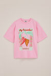 Ein entspannter Look mit auffälliger Ausstrahlung. Dieses T-Shirt hat eine Oversized-Passform, einen Rundhalsausschnitt und kurze Ärmel, mit einem kleinen Print und einer Stickerei auf der Vorderseite für einen verspielten Touch, und dieser in groß auf dem Rücken.