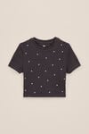 Hat zwar weniger Stoff, ist aber ein starkes Modestatement. Dieses T-Shirt hat eine taillierte Passform, kurze Ärmel, Rippbündchen und Nieten, die deinem Outfit das gewisse Etwas verleihen. Kompakt in der Größe, groß in der Wirkung.