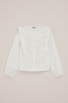 Kreiert die tollsten Looks. Diese gepunktete, strukturierte Bluse hat eine normale Passform, einen Rundhalsausschnitt und lange Ärmel mit elastischen Bündchen. Die Rüschen und Stickereien auf der Vorderseite und an den Schultern sorgen für ein verspieltes Finish.