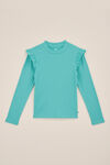 Schimmere und glänze durch den Tag. Dieses schmal geschnittene T-Shirt hat silbernes Glitzergarn und Rüschen an den Schultern. Mit langen Ärmeln für Wärme und einen stylischen Look, ideal für die Schule oder eine Party.