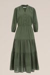 Schön von oben bis zum Streifen. Dieses Midikleid hat einen eleganten V-Ausschnitt mit Knöpfen, einen Gummizug in der Taille für zusätzlichen Komfort und einen Rock mit drei luftigen Streifen, die deinem Look einen verspielten, femininen Touch verleihen.