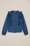 C'est l'indispensable pour les filles. Cette blouse rayée regular fit est confectionnée en coton denim et possède une fermeture boutonnée, un col rond et des manches longues. Les volants de la chemise en jean complètent le vêtement.