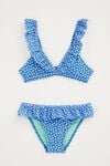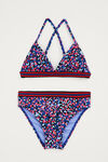 Bikini entièrement doublé à motif sur toute la surface et ruchés. Haut à bretelles ajustables et fermoir de plastique dans le dos.