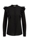 Chemisier de coton regular fit à broderie anglaise et volant. Modèle à fermeture boutonnée invisible, col rond et manches longues.