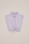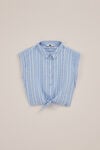 Aéré, joyeux et parfait pour les journées ensoleillées. Dotée d’un col et d’une fermeture à boutons, ce chemisier sans manches se distingue par sa texture en seersucker épais. L’imprimé à rayures verticales et le nœud en bas le rendent encore plus sympa.
