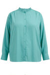 Un chemisier en viscose de coupe régulière avec une structure et une fermeture à boutons. Le modèle a une encolure ronde à volants et des manches longues.