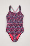 Maillot de bain entièrement doublé à motif sur toute la surface, détail de galon à la taille et bretelles croisées.